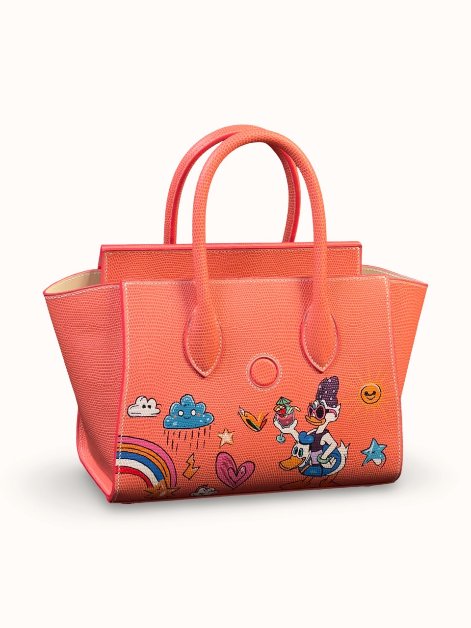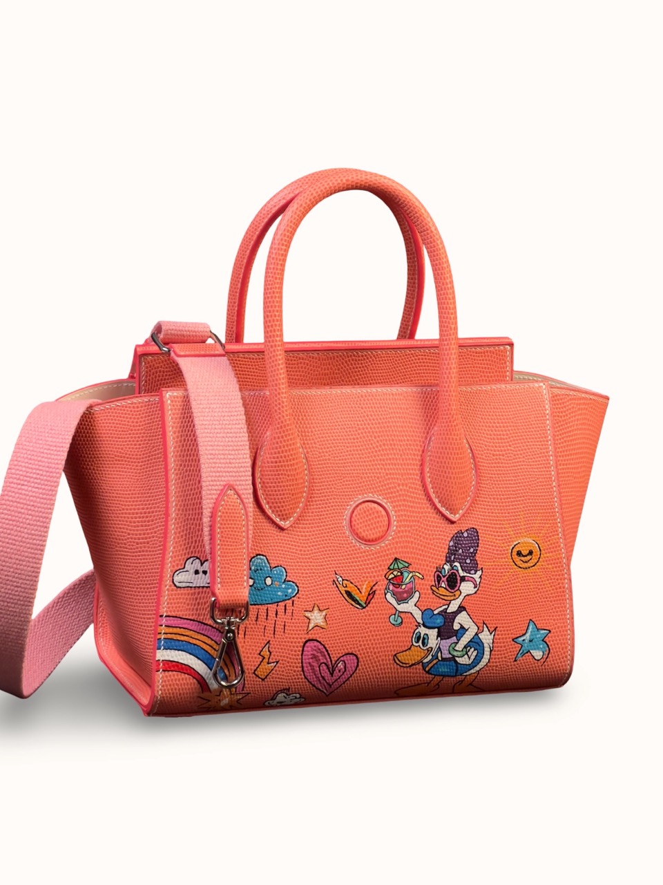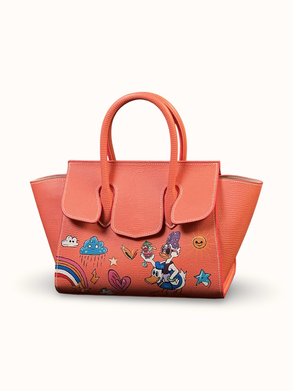 The bag has an author's painting in the style of Pop Art, which makes it not just an accessory, but a real art object. The French saddle stitch, made by hand with linen thread, guarantees durability and perfect seams.